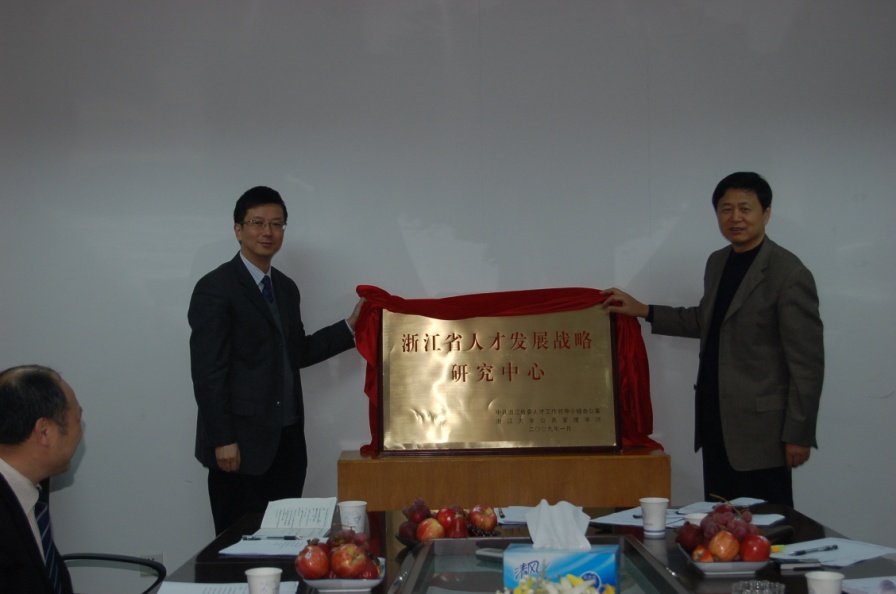 2009年1月22日,浙江省人才发展战略研究中心在浙江大学公共管理学院正式成立。研究中心依托于浙江大学公共管理学院,旨在进一步加强浙江省人才工作基础理论研究和实证调查,提高人才工作水,服务于浙江省经济和社会发展的需要。浙江省委组织部副部长姚志文,浙江大学党委副书记邹晓东出席成立仪式并为研究中心揭牌。出席成立仪式的还有浙江省人才工作办公室副主任徐晓光、江美塘、徐旻,以及浙江大学公共管理学院陈丽君、徐伟红、郭继强、郭夏娟、苗青等多位人才研究领域的专家学者。