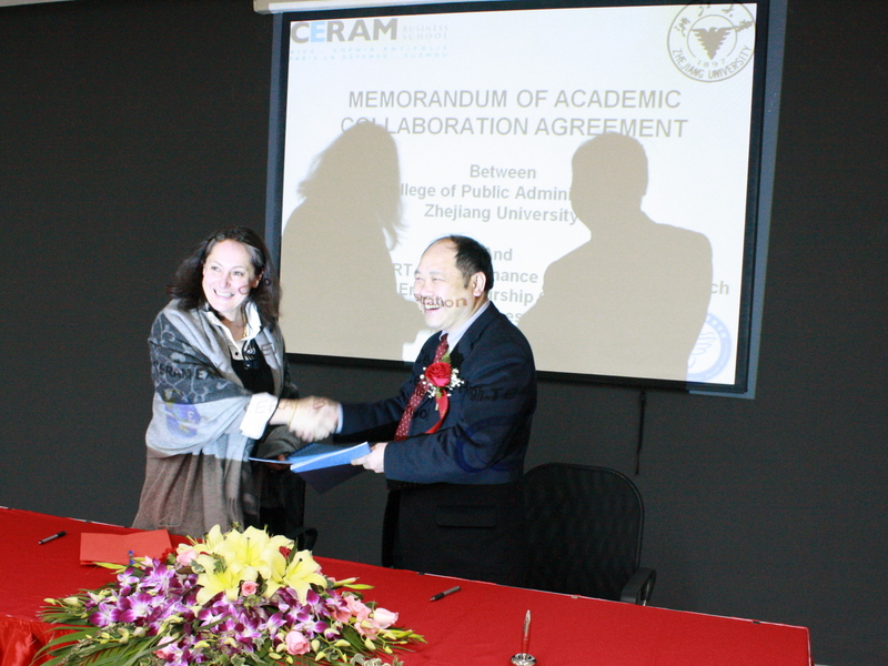 2009年2月27日下午三点三十分,姚先国院长与法国商科联盟国际商学院校长(CERAM Business School)Alice Guilhon在苏州CERAM分校签订了浙江大学公共管理学院与CERAM商学院Global Finance Center & Entrepreneurship & Innovation Center进行合作的协议。协议包括双方互派教师及学生交流,共同举办国际学术会议以及双方在风险管理、保险、国家风险分析、企业创新等方面进行合作研究。尼斯天蓝海岸工商会副会长Mr Jean-Michel Matas ,CERAM Business School副校长Dr Michel-Henry Bouchet等参加了签约仪式。