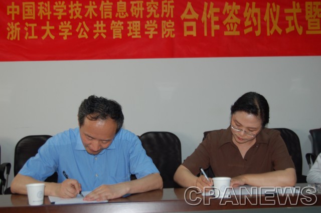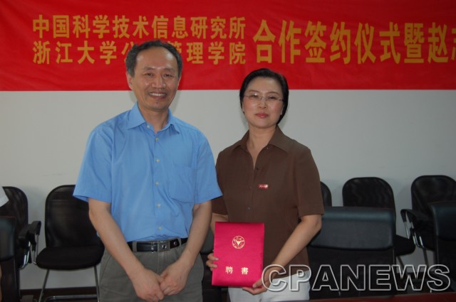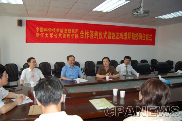 6月17日下午,中国科学技术信息研究所、浙江大学公共管理学院合作签约仪式暨赵志耘兼职教授聘任仪式在玉泉校区外经贸楼107会议室举行,社科学部副主任余逊达教授、信息资源管理系系主任叶鹰教授出席了聘任仪式。