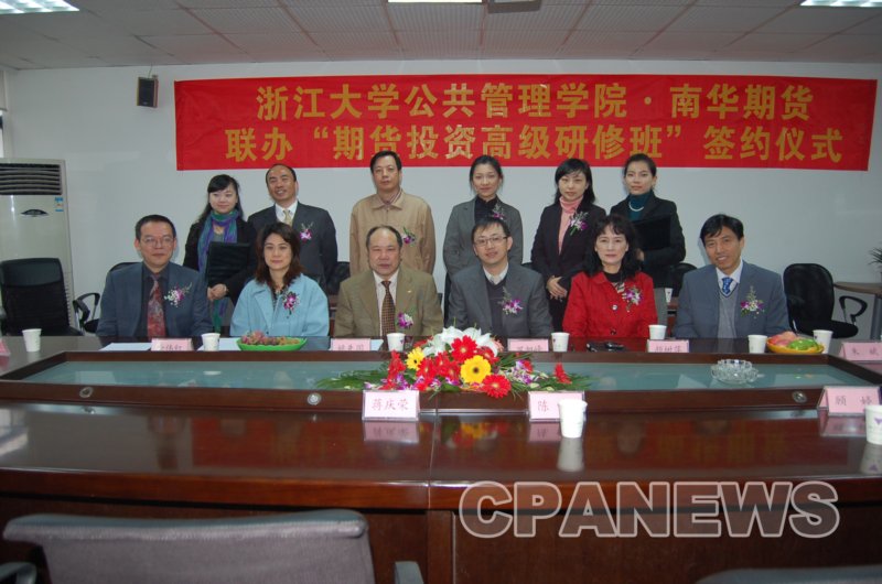 公共管理学院姚先国院长在签字仪式上讲到当前这场波及全球的金融危机根本是制度和人力管理的缺失,加强金融行业投资者的培训和教育是金融业健康发展的关键,这次携手南华期货开展投资者培训不仅是对期货投资者的专业技能的培训,更是促进期货行业健康快速发展的一次尝试。南华期货总经理罗旭峰在签字仪式提到中国期货业特别是浙江期货才刚刚发展起步,期货业市场潜力巨大,通过与浙江大学合作开展期货投资者培训,不仅能提高期货投资者的管理和经营水平,而且对浙江期货业的蓬勃健康发展有着重要意义。