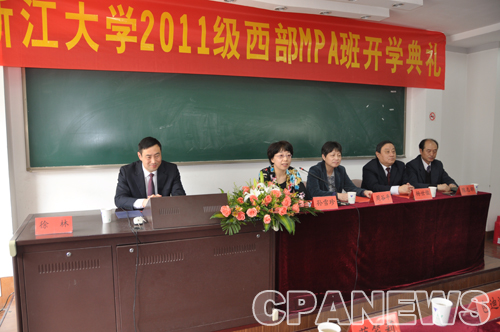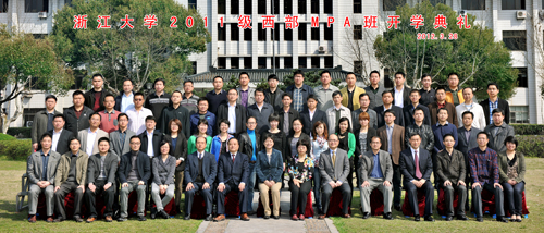 2012年3月28日,浙江大学2011级MPA西部地区领导干部班(以下简称“西部班”)开学典礼在西溪校区隆重举行。浙江大学党委副书记、浙江大学中国西部发展研究院常务副院长周谷平,四川省发改委巡视员杨世佐,中国西部人才开发基金会副秘书长陈志朝,国家发改委西部开发司处长孙雪珍,广西自治区发改委西部处副处长李斌、甘肃省西部办副调研员张晖、重庆市发改委西部办彭应举,浙江大学公共管理学院党委书记包迪鸿,浙江大学研究生院学科建设处副处长蒋笑莉,浙江大学中国西部发展研究院副院长董学兵,浙江大学MPA中心主任徐林、副主任谭荣等领导出席了开学典礼。会议由浙江大学MPA中心主任徐林主持。