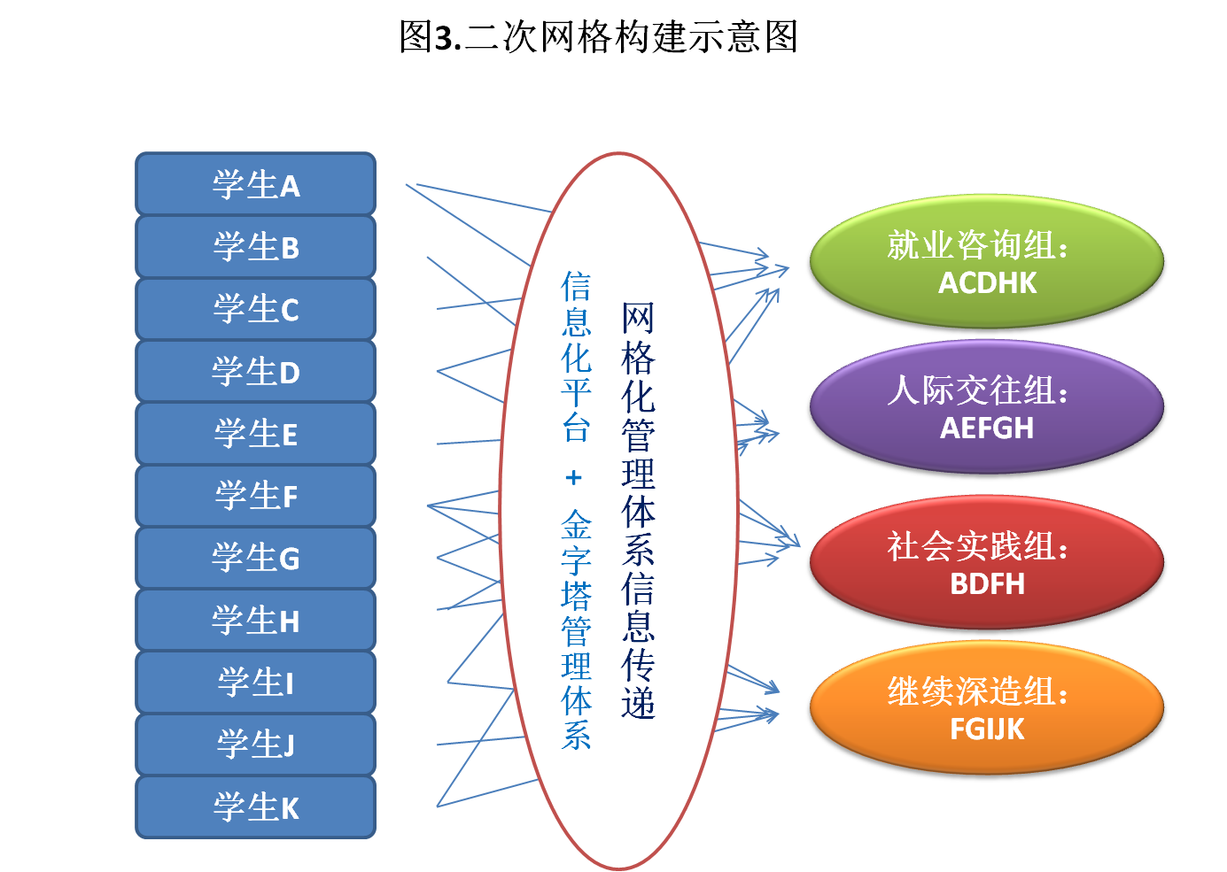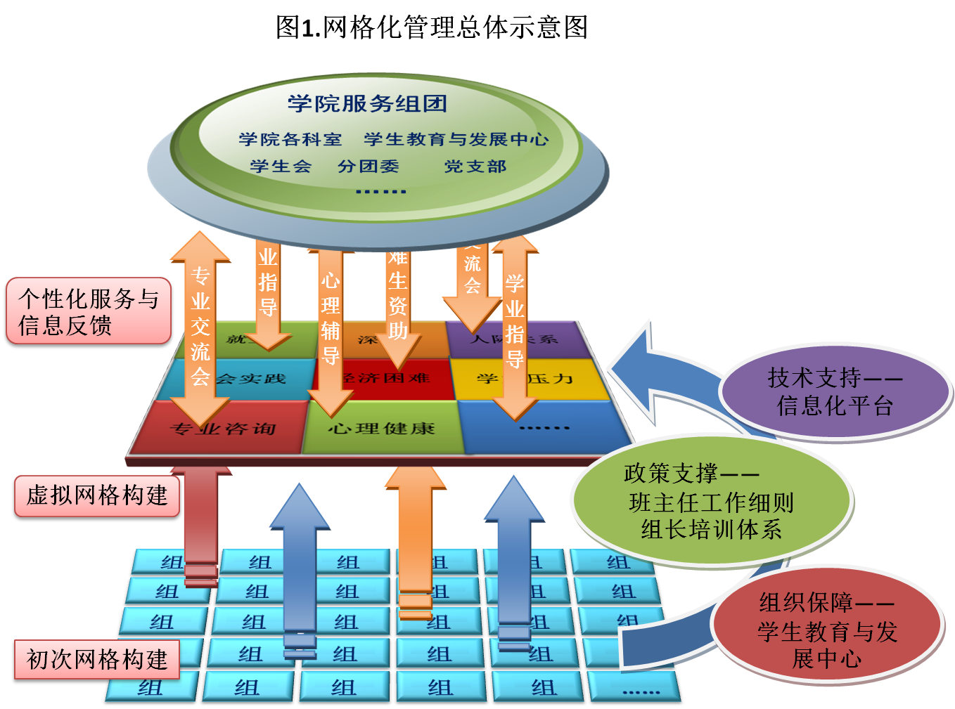 传统的“班级——年级——学院(园)”管理模式作为网格化管理雏形一直存在于高校学生管理中,但这与真正意义上的网格化管理与组团式服务相比,显然存在一些不足,比如:信息技术的运用并不充分,层级之间单向管理较多,学院层级以思政工作为主、与学生教务管理分离等。造成无法完全实现网格化管理所提倡的组团式服务,不利于管理的整体性与精细化,无法提供较好的个性化服务。