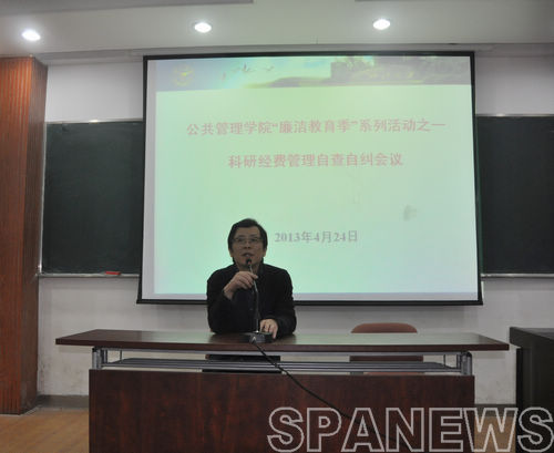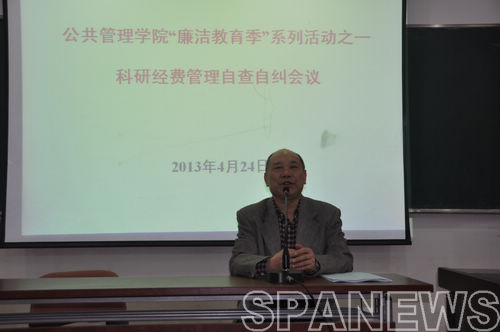 4月24日下午,公共管理学院在玉泉校区外经贸楼111室召开了科研经费管理自查自纠会议,作为公共管理学院2013年度“廉洁教育季”系列活动之一。会议由学院主管科研工作的毛丹副院长主持,学院科研与地方合作办公室主任冯军作了重要报告,院长姚先国和党委书记、副院长包迪鸿作了重要讲话。学院全体教职工参加了会议。