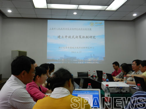 6月27日,由浙江大学中国地方政府创新研究中心举办的“建立开放式决策机制研究”学术研讨会在邵逸夫科学馆顺利进行。中心主任陈国权教授、中心博士后叶勇、访问学者王金鑫、陈建平及全体研究生参加了会议。同时应邀参加会议的还有上海市人民政府法制办公室副主任顾长浩,上海市人民政府法制办公室法律事务协调处处长李平,上海市人民政府法制办公室、上海市行政法制研究所王松林。