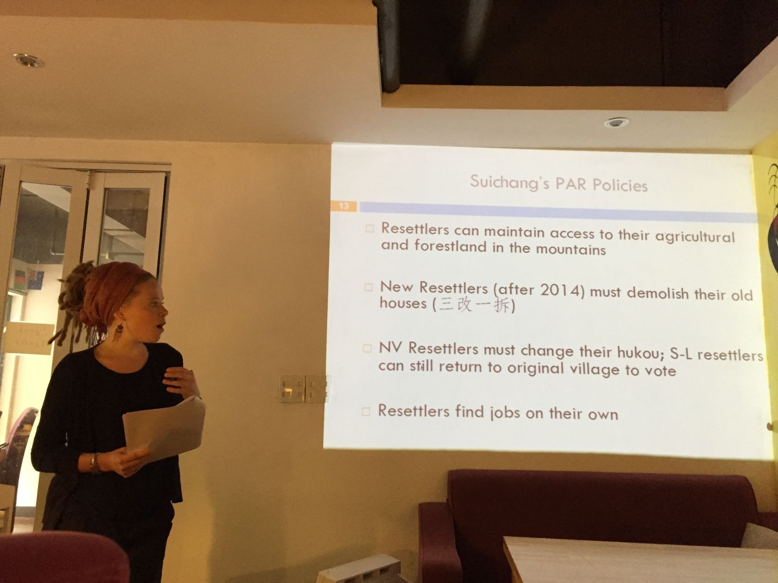 Elena指出,中国农村扶贫开发计划有三大目标:减少贫困人口、完善农村基础设施建设以及保障国家粮食安全。随着“下山脱贫”政策的实行,欠发达山区农村移民安置过程中产生了许多值得关注的问题,如旧田征收、生态移民及强制拆迁等,由此引发了土地私有化还是坚持土地集体所有制的争议。在这样的背景下,她于2013年起展开了对丽水市遂昌县农村移民安置问题的调查研究。在研究中,她主要关注移民安置后村民如何与新、旧“社区”建立、维持联系的问题。