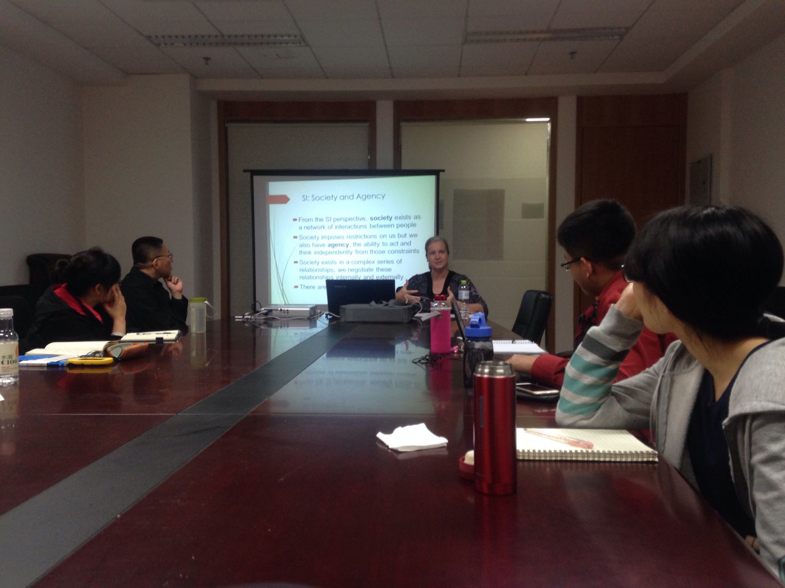 Dr. Walker随后结合自己的有关社会影响(social influence)的研究进一步展示了群体过程这一视角下对社会规律的科学探究,同时简要介绍了社会科学研究中的实验方法。在座师生对实验设置下如何操控社会身份、如何观察和测量社会影响等产生了浓厚兴趣并展开了热烈讨论,讲座结束后Dr. Walker 在接下来的几天里与同学们继续就社会心理学、实验设计、群体过程等学术问题以及美国研究生教育进行了多次交流和座谈。