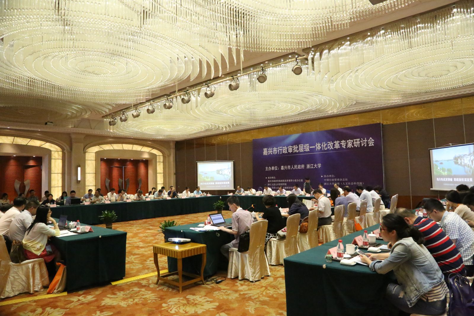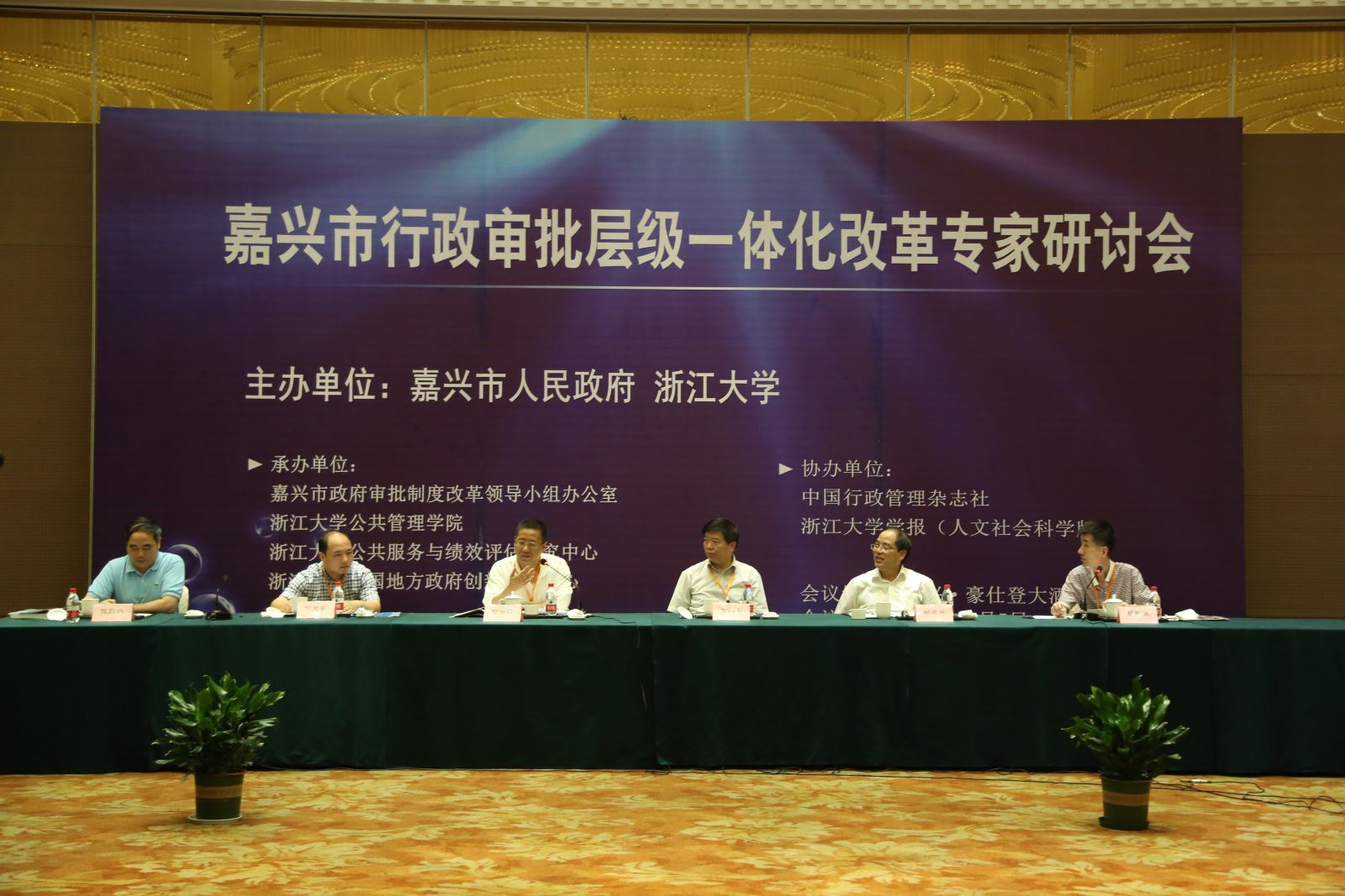 2015年7月5日,由嘉兴市人民政府、浙江大学主办,嘉兴市政府审批制度改革领导小组办公室、浙江大学公共管理学院、浙江大学公共服务与绩效评估研究中心、浙江大学中国地方政府创新研究中心承办,中国行政管理杂志社、浙江大学学报(人文社会科学版)协办的2015年嘉兴市行政审批层级一体化改革专家研讨会在嘉兴市召开,来自中国行政管理学会、中央编译局、浙江省发改委、北京大学、清华大学、中国人民大学、浙江大学、哈尔滨工业大学、兰州大学的学者和嘉兴市各县市区主管单位领导共50余人参加了此次研讨会。