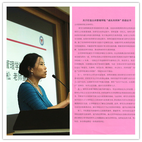 包松副书记宣读了《打造公共管理学院“成长共同体”倡议书》。倡议书指出,在研究生培养过程中,导师是第一责任人,导师与学生之间的有效沟通与和谐关系的构建,对于保证研究生培养质量,实现人才培养目标至关重要。导师要关心学生的全面发展,在注重对研究生科研学术领域指导的同时,需要更多关注学生的身心健康,在提升学生视野与综合实践能力上面下功夫。研究生要不断提升研究能力,并学会合理表达自己的意愿,学会用坦诚而开放的方式与导师就自己的未来专业发展方向、职业取向乃至生活情感上的困难困惑进行交流。学院要为加强师生交流提供条件,搭建学术及思想交流平台,推动形成师生之间亦师亦友、良师益友的和谐关系。