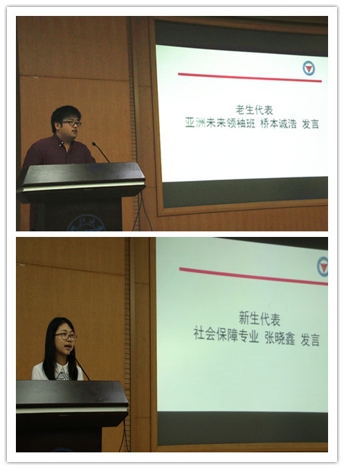 高年级研究生代表,“亚洲未来领袖”项目2015级桥本诚浩同学致辞,勉励各位新同学在学习生涯中一定要拥有包容开放的心态,用积极主动的态度去面对一切问题。新生代表张晓鑫表达了对即将开始的研究生生活的憧憬,也表达了潜心学问、谨慎治学的态度和决心。