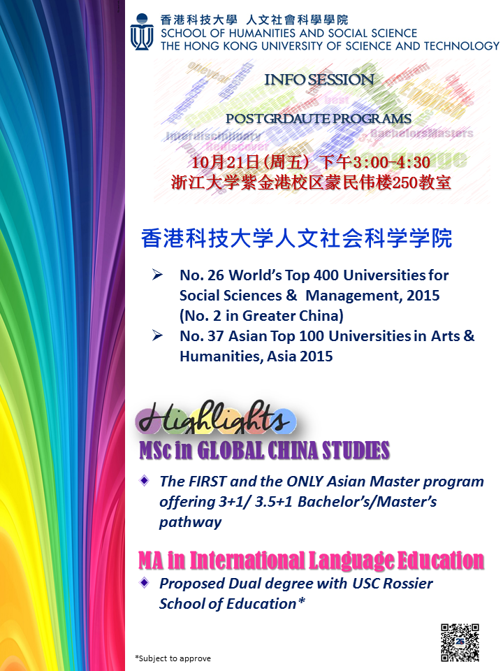 香港科技大学人文社会科学学院将于21日在我校举办研究生项目宣讲会并当场答疑。宣讲会内容涉及该学院所有研究生课程(研究硕博及课程型硕士),其中重点宣讲“环球中国研究”3+1项目和国际语言教育项目。