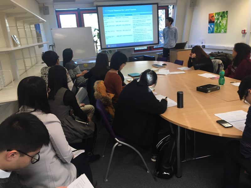 首先来自剑桥大学的博士生同学Liangqi Wu作了名为“Inter-jurisdictional Political Competition and Land Finance in China”的研究报告。他的研究着眼于地方政府竞争与其土地出让行为间的关系,其扎实细致的文献梳理给代表团成员留下了深刻印象。(图为代表团成员听取Liangqi Wu同学的学术展示)