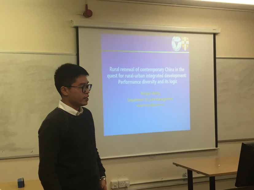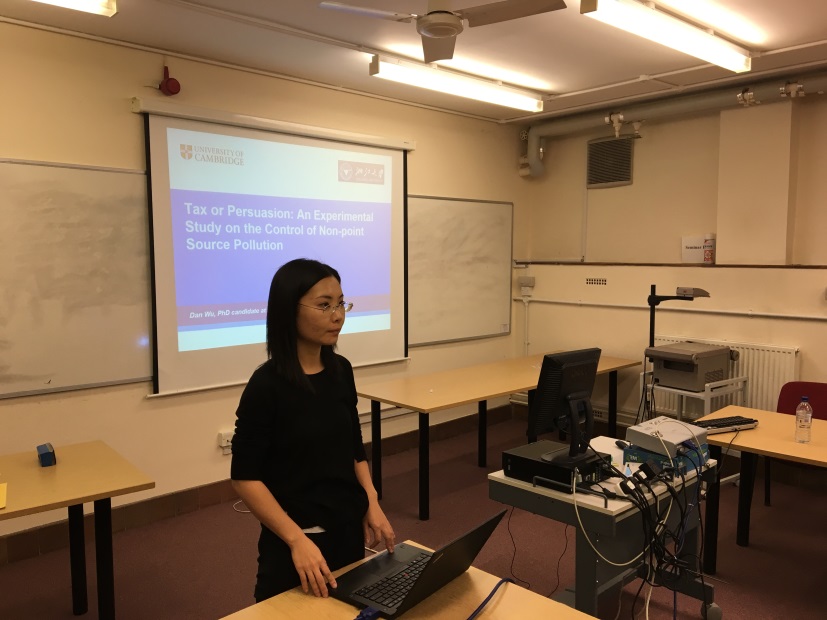 短暂的休息后,我院土地管理系的八位博士生,从与土地相关的各个研究视角出发,分别与剑桥大学土地经济系的师生们交流了自己最新的学术成果。吴丹用实验经济学方法检验了集体税,劝说以及二者结合三种手段的效率和持久性,结果显示政策组合的效率和持久性都是最好的,从而可以为现实的政策推广提供参考;张晓滨从集体行动角度对土地整理权属调整过程中农民的行动机制进行了解释,证明了土地转让可以显著改变农民群体结构和数量,从而推动权属调整进程。(图为吴丹展示自己的研究成果)