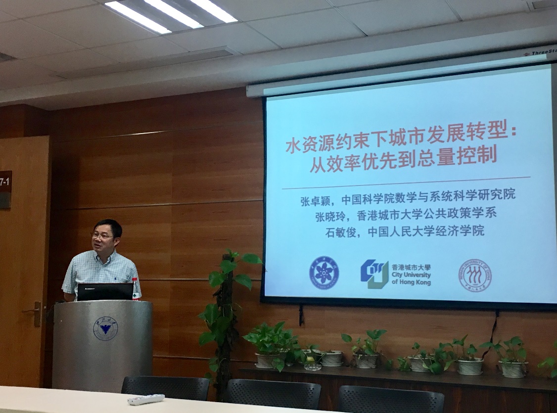 石敏俊教授的报告题目为“水资源约束下的城市发展转型:从效率优先到总量控制”。石教授从空间不可能定理出发阐述了城市形成与发展的经济学机制,并介绍了城市转型与可持续发展中弱可持续性和强可持续性等相关理论知识,然后以北京市为例,对1992-2012年城市发展战略与应对资源环境约束的关系进行分析指出:北京市应对水资源约束的城市转型经历了GDP导向、用水效率优先导向以及用水总量控制导向三个发展阶段;随着城市发展面临的水资源制约程度的变化,北京市的发展理念出现了从弱可持续性向强可持续性的转换。