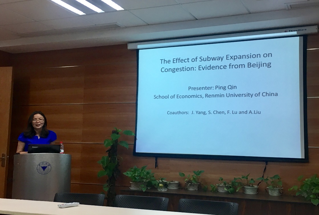 秦萍副教授以“The Effect of Subway Expansion on Congestion: Evidence from Beijing”为题做了报告。秦萍副教授介绍了断点回归的方法,对2009-2015年北京市六期共11条地铁线开通对北京短期拥堵的影响进行分析,指出新地铁开通后车辆拥堵急剧下降,早、晚两个高峰时段的交通量都有明显的改善。同时,通过成本收益分析,秦萍副教授指出北京市地铁建造后交通拥堵缓解所带来的收益要略高于建造地铁的成本。