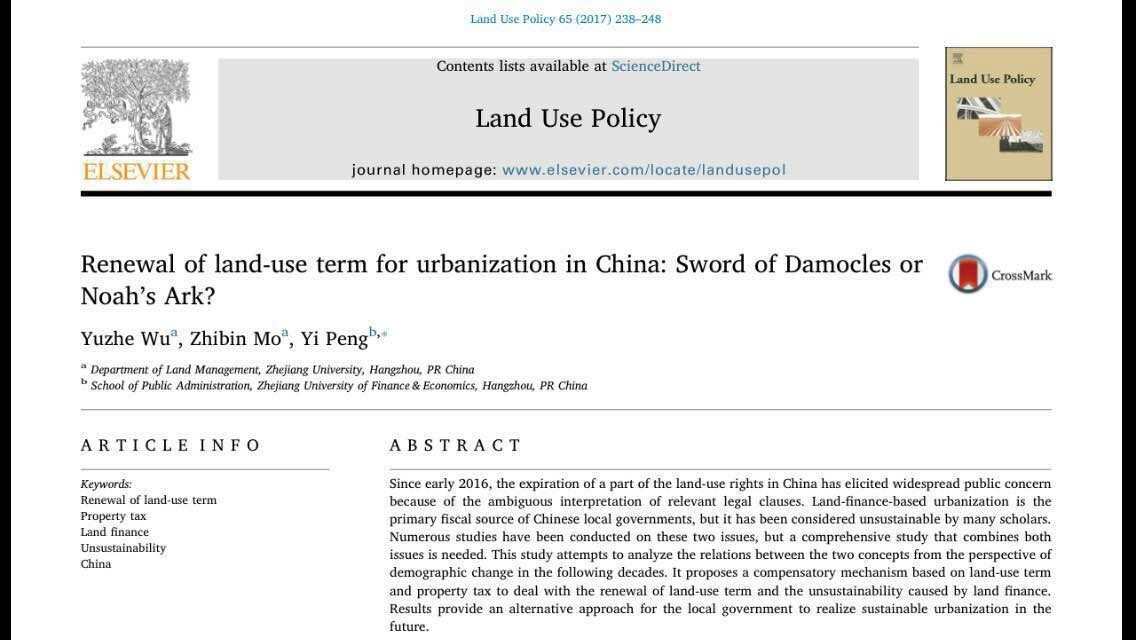 日前,由我院吴宇哲教授、博士生莫智斌及浙江财经大学彭毅副教授合作撰写的论文‘Renewal of Land Use Term for Urbanization in China: Sword of Damocles or Noah’s Ark?’被国际知名期刊Land Use Policy接收,并于4月22日见刊发表。Land Use Policy是土地政策领域的顶级期刊,内容涵盖城市和农村土地利用相关的社会、经济、政治、法律、规划等多个方面,期刊影响因子为2.768。