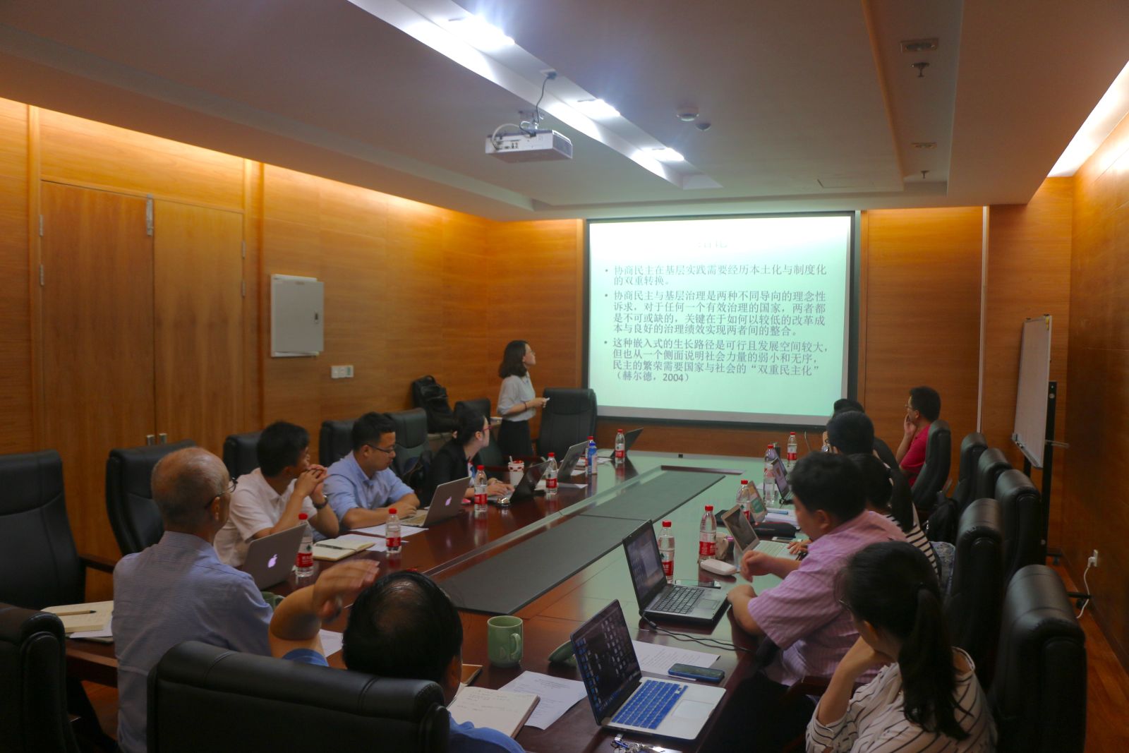 6月22日上午,北京大学中国政府治理研究中心和浙江大学中国地方政府创新研究中心于蒙民伟楼266室联合召开地方政府治理研讨会。会议由北大政府管理学院教授、博士生导师、副院长徐湘林主持,与会人员包括浙江大学公共管理学院教授、浙江大学中国地方政府创新研究中心主任陈国权,浙江工商大学教师毛益民博士,浙江省社会主义学院教师曹伟博士以及来自北大徐湘林教授团队和浙大陈国权教授团队的11名博士生。研讨会由北大团队、浙大团队的各三位优秀博士生交叉汇报,两个团队对彼此研究议题进行深入对话,积极交换意见。