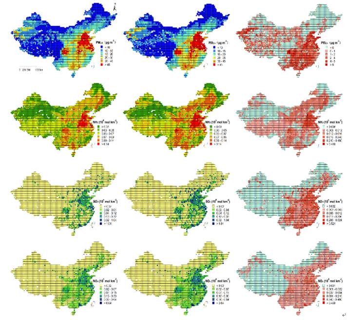 通过人类-自然耦合系统(Coupled Human And Natural Systems, CHANS)模型的计算,课题组发现我国目前每年的NH3排放量应该高于1500万吨,而且应该呈现出持续增加的趋势(图1)。但是之前的研究都认为NH3的排放量可能不足1000万吨。为此,课题组利用CHANS模型重新评估了我国NH3排放量,并利用全国氮沉降监测网络(定期收集测定空气中通过降水和颗粒物落下来多少含氮物质)和大气卫星遥感的监测数据,验证了我国NH3排放大约在1560万吨,之前工作平均低估了40%以上。并且发现90%左右的NH3挥发来自于农业土地利用,强调了农业污染排放对我国城市PM2.5的影响。同时NH3挥发和沉降之间的缺口越来越大,意味着通过盛行西风传输到太平洋的污染物量越来越多,对海洋生态系统的影响也越来越大。