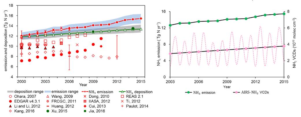 图1 我国NH3排放、以及与沉降和卫星监测数据的比对验证(Zhang et al., 2017)