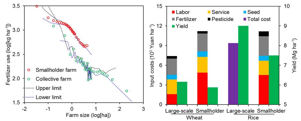 图4 不同农地规模下我国农田的化肥施用和投入产出(Ju et al., 2016)