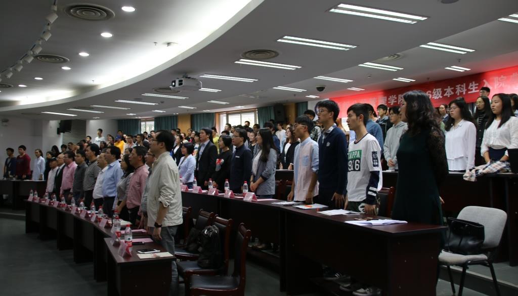 典礼伊始,全体起立高唱国歌。阮俊华介绍到场领导和嘉宾老师,并代表学院对新加入的2016级本科生表示祝贺和欢迎!