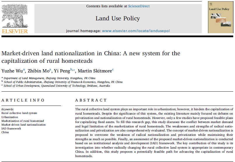 日前,由我院吴宇哲教授、博士生莫智斌、浙江财经大学彭毅副教授及昆士兰科技大学Martin Skitmore教授合作撰写的论文Market-driven land nationalization in China: A new system for the capitalization of rural homesteads被国际知名期刊Land Use Policy接收,并于11月10日见刊发表。Land Use Policy是土地政策领域的顶级期刊,内容涵盖城市和农村土地利用相关的社会、经济、政治、法律、规划等多个方面,期刊影响因子为2.768。