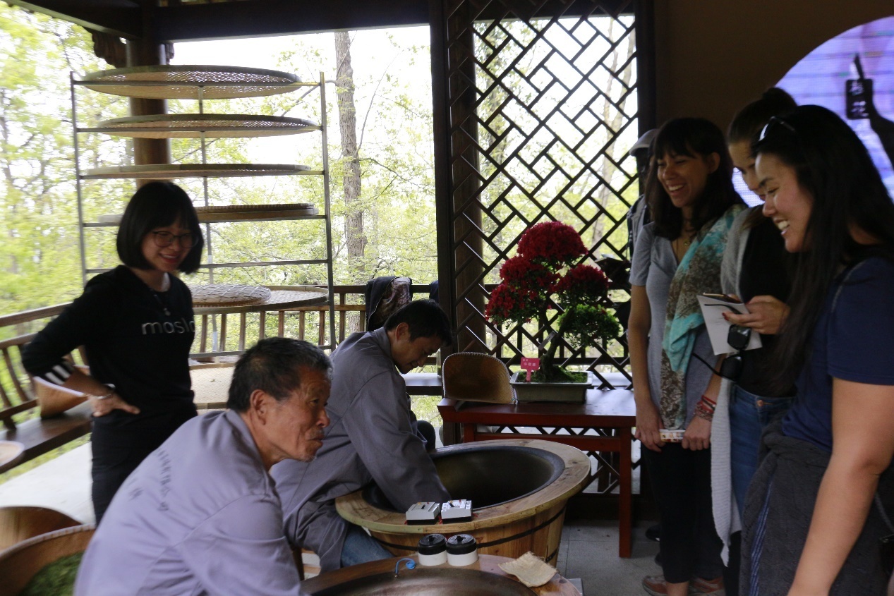 走出茶展厅,在一座山亭里,大家看到了几位制茶的师傅,淡淡的茶香芬芳扑鼻,飘散在整个山亭里,学员们惊喜地与师傅们亲切交流,了解制茶的工艺。制茶师傅说,龙井茶的制茶工序颇为复杂,甚是讲究,其中炒制需要手工完成,更是要依据不同鲜叶原料在不同炒制阶段分别采取“抖、搭、捺、拓、甩、扣、挺、抓、压、磨”等十大手法。学员们一边满怀好奇地观摩,一边赞叹制茶工艺的考究。