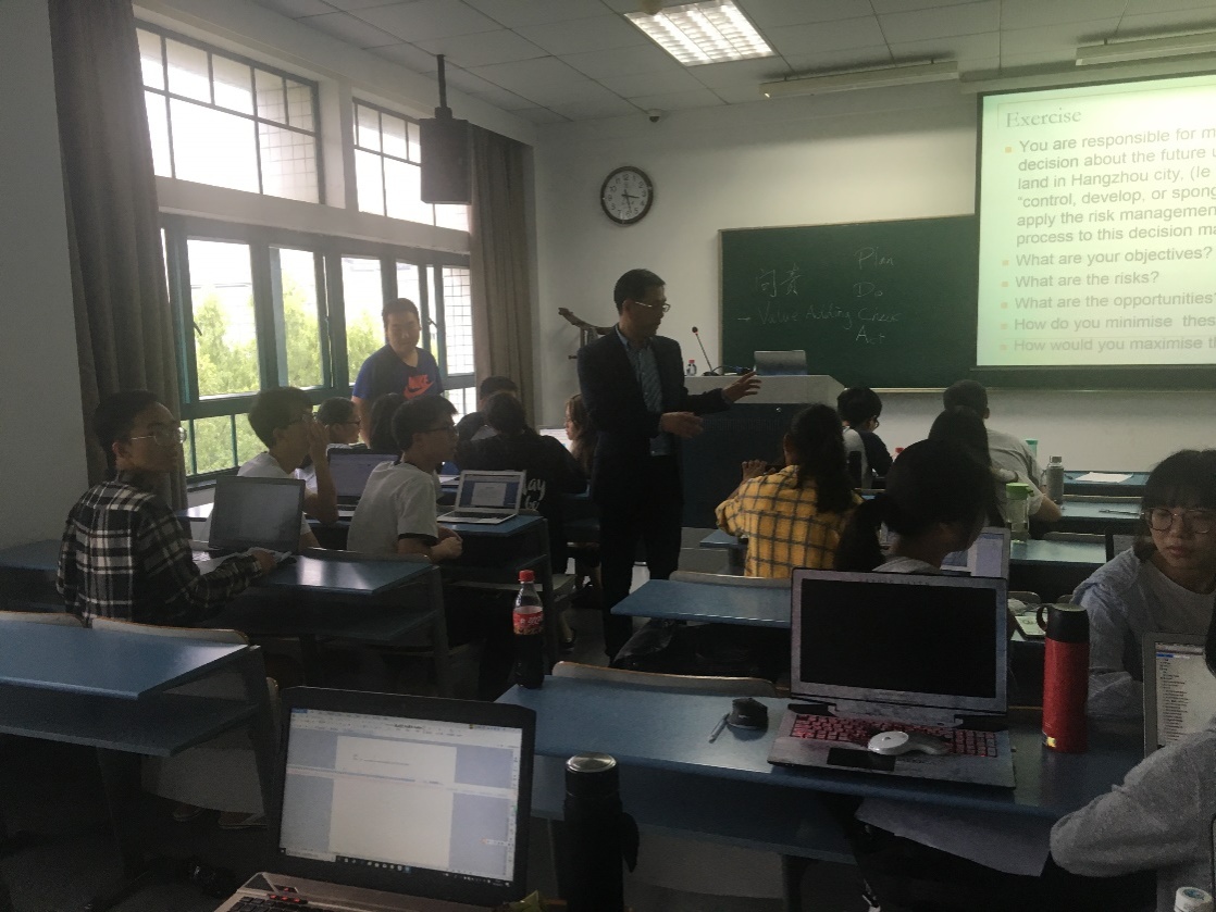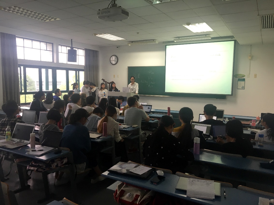 介绍完理论部分之后,Patrick随即布置了一个团队作业,要求同学们在25分钟之内运用风险管理的原理对杭州市内250平方公里的土地做出规划设计。同学们思维活跃,富有创造力,讨论过程十分热烈。到了展示环节,各个小组分工展示、主持、提问、计时,配合密切。在展示中,同学们采取了PPT展示、记者问答等丰富的形式,对风险管理的知识活学活用,作业完成效果良好,获得了Patrick的赞赏。最后,小组投票选出了最佳表现小组,该小组获得了Patrick的特别礼物。此次课堂理论与实践结合,个人与团队合作结合,气氛热烈,学习效果良好。
