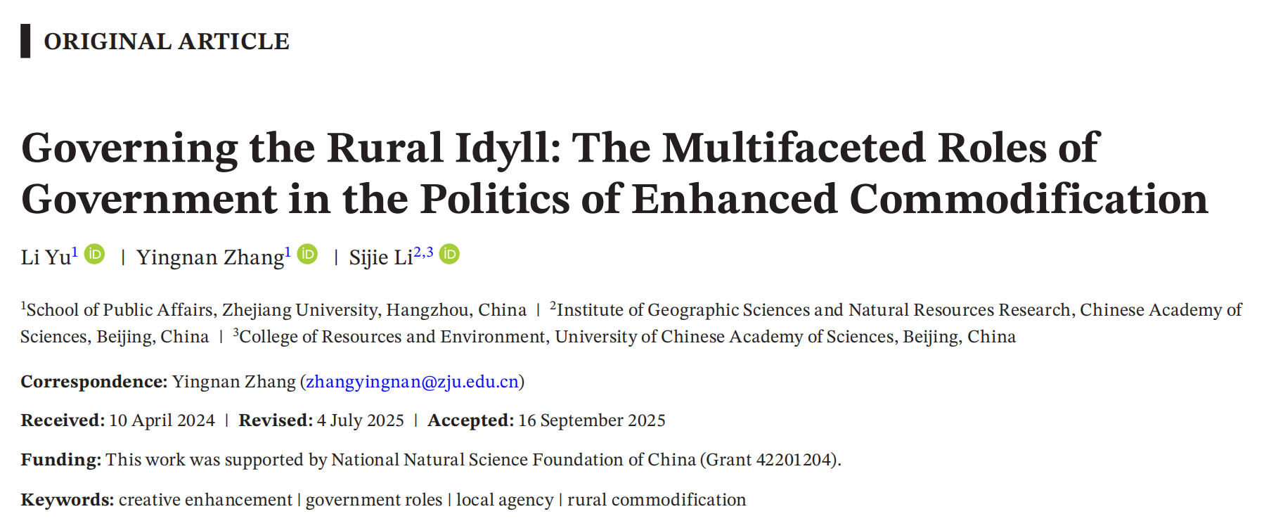 近日,由浙江大学公共管理学院张英男研究员与研究生余黎、李思捷合作完成的论文“Governing the Rural Idyll: The Multifaceted Roles of Government in the Politics of Enhanced Commodification”在美国乡村社会学会主办期刊(季刊)Rural Sociology在线发表。张英男副研究员为本文通讯作者。