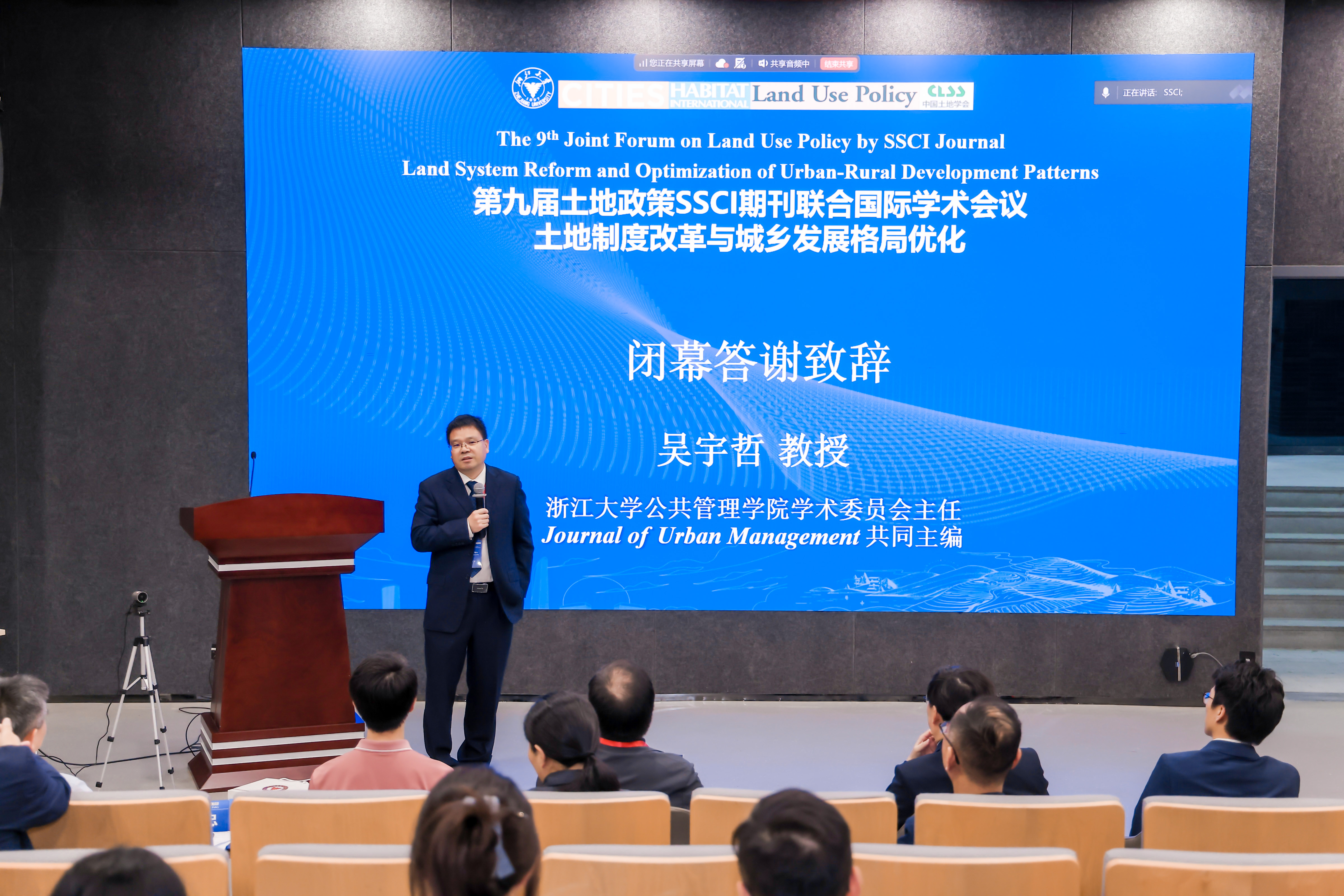 圆桌论坛后进入会议闭幕式,由大会执行主席、浙江大学吴宇哲教授致闭幕答谢词。他紧扣“真问题”、“真交流”、“真爱”三个关键词,强调土地研究应直面民生需求,感谢与会学者带来的思想碰撞,并指出城乡融合与学科交叉是承载对土地与社会深沉关爱的未来方向。最后,他向与会嘉宾和代表、会务组全体人员表示由衷感谢,宣布第九届SSCI期刊国际联合学术会议胜利闭幕。