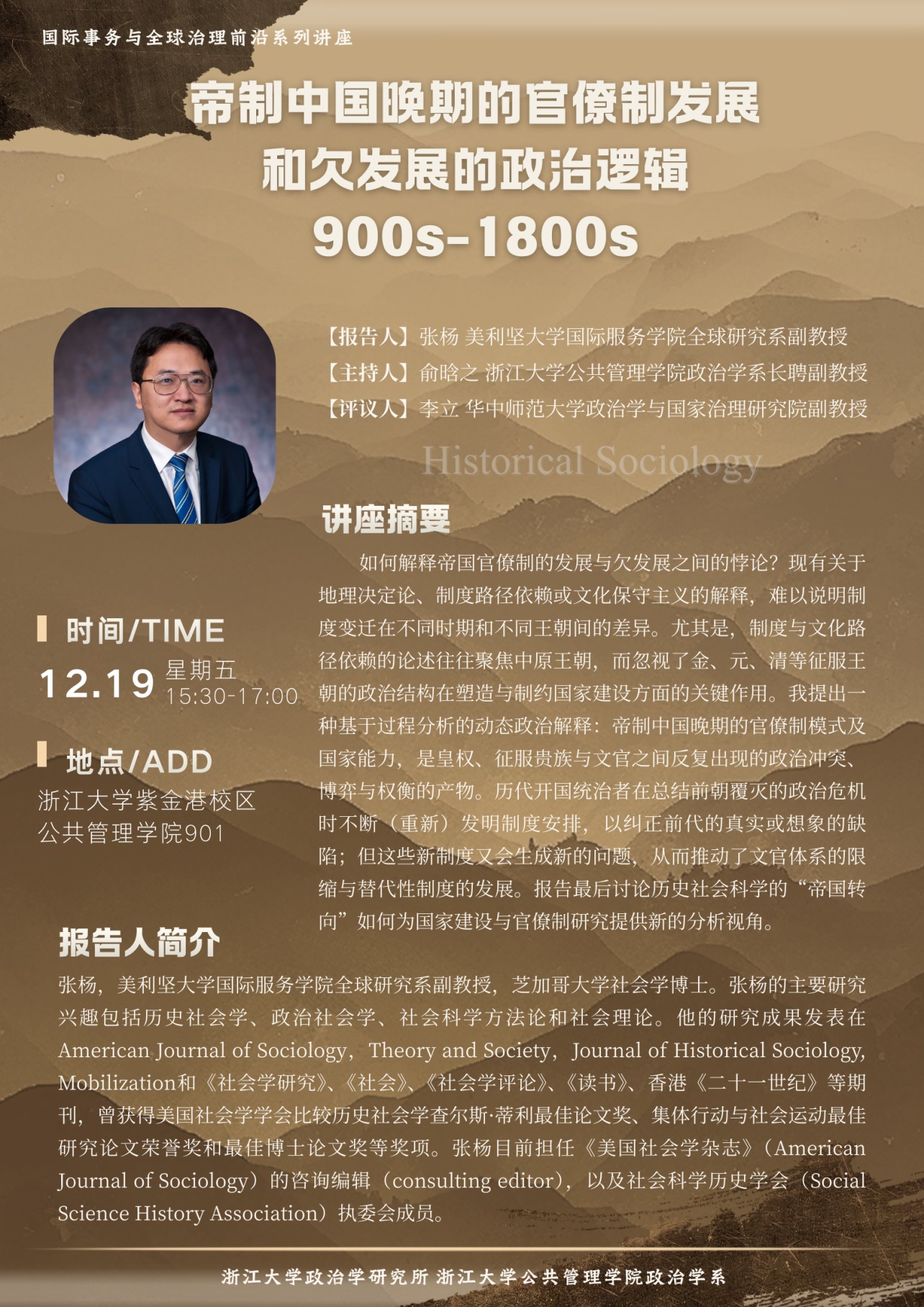 如何解释帝国官僚制的发展与欠发展之间的悖论?现有关于地理决定论、制度路径依赖或文化保守主义的解释,难以说明制度变迁在不同时期和不同王朝间的差异。尤其是,制度与文化路径依赖的论述往往聚焦中原王朝,而忽视了金、元、清等征服王朝的政治结构在塑造与制约国家建设方面的关键作用。我提出一种基于过程分析的动态政治解释: 帝制中国晚期的官僚制模式及国家能力,是皇权、征服贵族与文官之间反复出现的政治冲突、博弈与权衡的产物。历代开国统治者在总结前朝覆灭的政治危机时不断(重新)发明制度安排,以纠正前代的真实或想象的缺陷;但这些新制度又会生成新的问题,从而推动了文官体系的限缩与替代性制度的发展。报告最后讨论历史社会科学的“帝国转向”如何为国家建设与官僚制研究提供新的分析视角。
