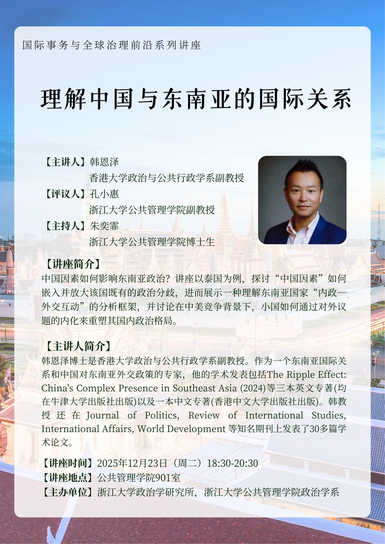 韩恩泽博士是香港大学政治与公共行政学系副教授。作为一个东南亚国际关系和中国对东南亚外交政策的专家,他的学术发表包括The Ripple EffectChina's Complex Presence in Southeast Asia (2024)等三本英文专著(均在牛津大学出版社出版)以及一本中文专著(香港中文大学出版社出版)。韩教授还在Journal of Politics, Review of International Studies,International Affairs, World Development 等知名期刊上发表了30多篇学术论文。