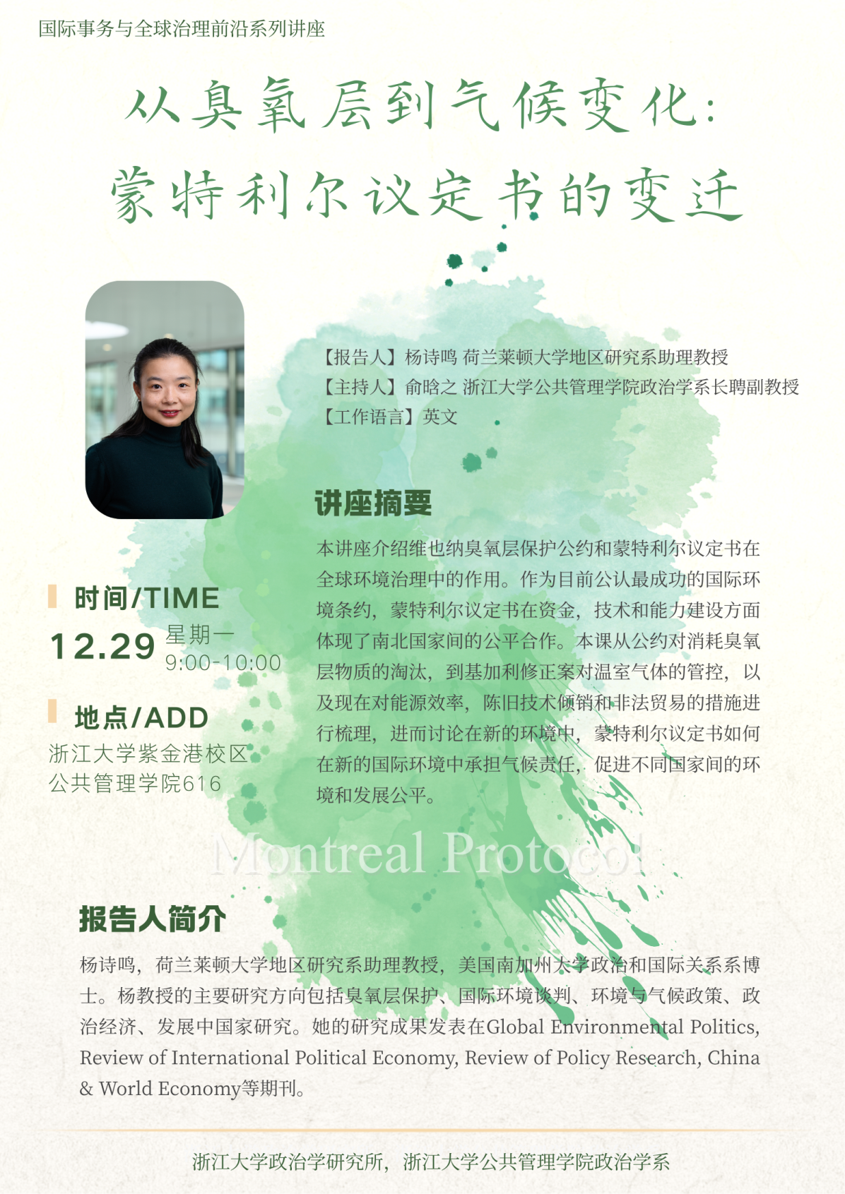 杨诗鸣,荷兰莱顿大学地区研究系助理教授,美国南加州大学政治和国际关系系博士。杨教授的主要研究方向包括臭氧层保护、国际环境谈判、环境与气候政策、政治经济、发展中国家研究。她的研究成果发表在Global Environmental Politics,Review of International Political Economy, Review of Policy Research,China & World Economy等期刊。
