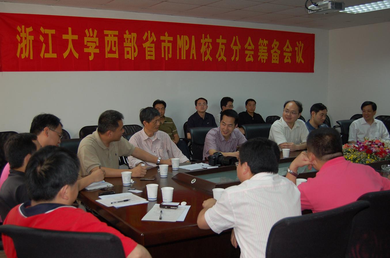 2009年5月22日下午,浙江大学西部省市MPA校友分会筹备会议在玉泉校区外经贸楼107会议室召开,浙江大学发展联络办公室校友事务部主任、校友总会秘书处办公室主任楼华梁,公共管理学院党委书记包迪鸿同志到会。来自广西、四川、内蒙、西藏等西部12省市(区)以及吉林延边和湖北恩施2个少数民族自治州的MPA校友会筹备小组正副组长参加会议,会议由MPA教育中心主任徐林主持。