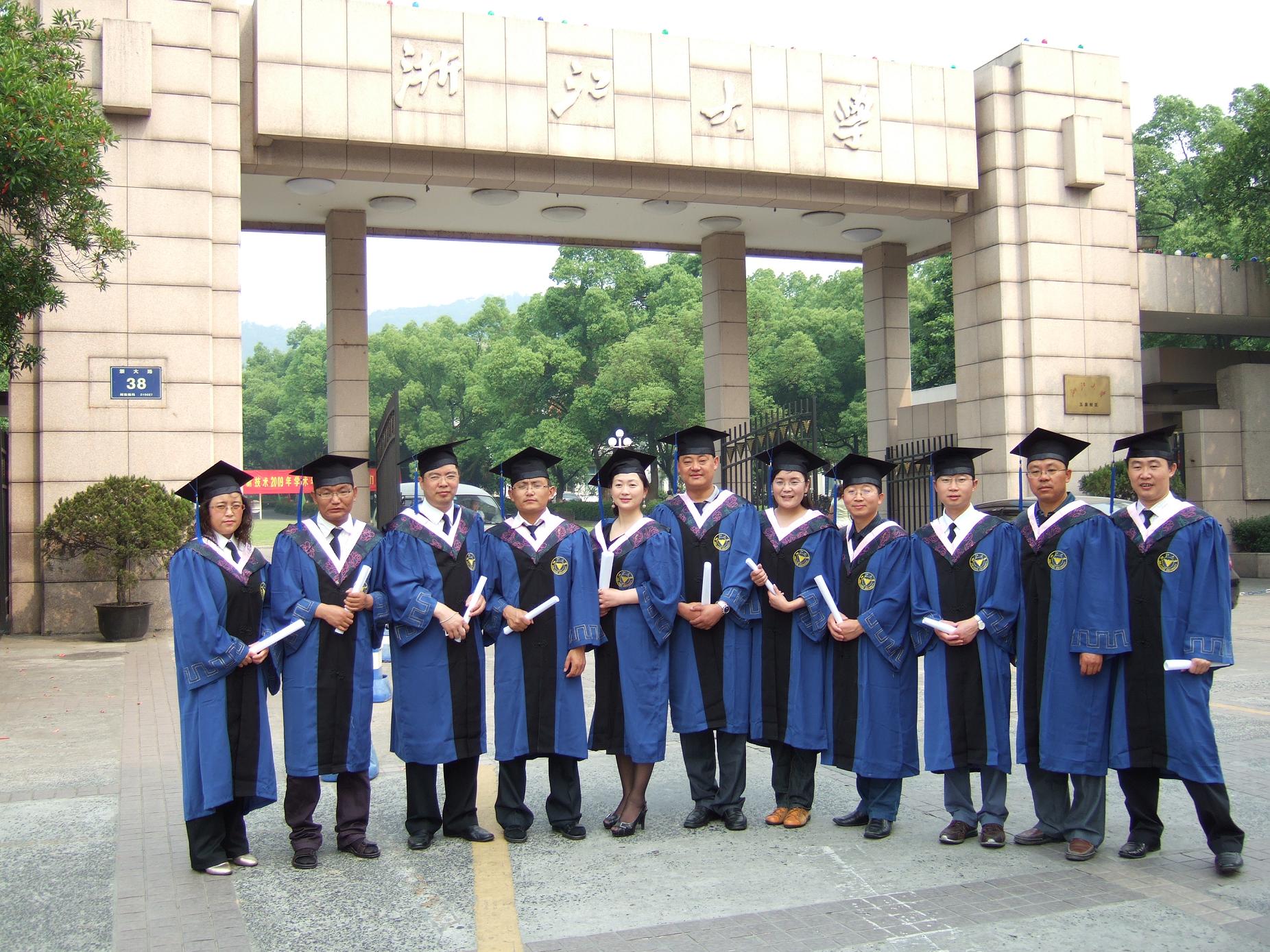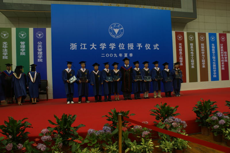 ,浙江大学在玉泉校区邵体馆举行隆重的学位授予仪式,浙江大学校长杨卫院士、公共管理学院院长姚先国教授等领导与获得学位的同学合影留念。