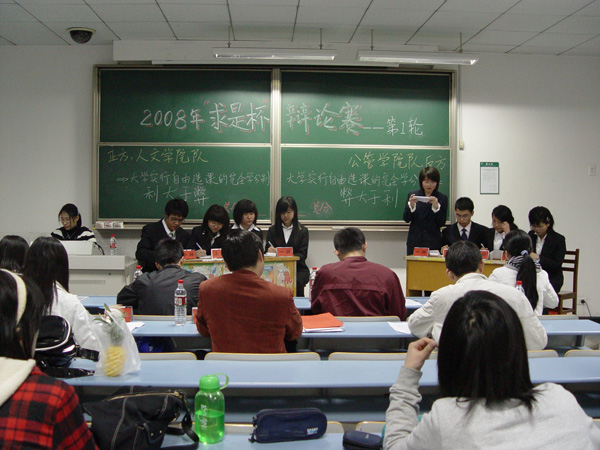 辩论赛的高潮莫过于自由辩论阶段,在此环节中,双方争论的焦点集中在“制度的公平与自由”“制度本身是否会促使学生功利心理”“教学质量能否得到保证”等问题上。其中,反方同学认为:这种完全自由的选课制度会导致同学们选择那些给分高而非自己需要的课程,同时由于各位同学的起点的不公平性,这种选课制度可能带给学生们更大的不公平(上课内容的不理解等)。针对反方同学的观点,正方同学也强有力的论证了己方的观点,他们指出:大学生们来到大学是为学习知识而并不是混学分的,即使有功利心也不会影响学习知识本身,另外,这种自由的选课制度为各位起点不同的同学提供了一个公平选择的平台。精彩的自由辩论将本次辩论赛推至高潮。