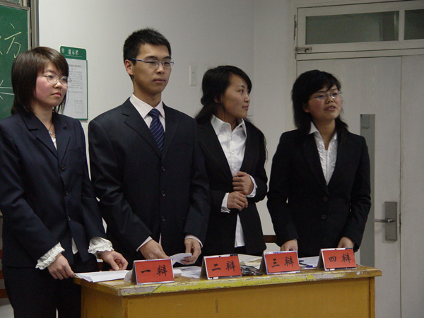 随后比赛正式开始,首先进入比赛的第一阶段——立论。正方辩友从三个角度阐述了他们的观点:1)学生角度:各取所需,量力而行2)制度角度:培养学生独立自主意识3)社会趋势:符合当今价值取向和社会趋势。相对应的,反方同学的立论环节也是从三个方面证实他们的看法:1)教师资源的有限性2)信息的不完整性3)教学班与行政班的脱离性。