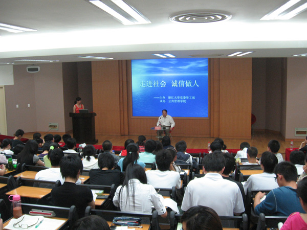 随后,主持人便邀请今天的主讲姚先国院长上台。姚院长先是对三位同学所讲的问题提出了自己的一些看法。接着谈了一下自己对诚信问题的几点看法和对同学们一些期望。整场讲座,姚院长不仅风趣幽默的举出很多耳熟能详的事例,更亲切的以自身和身边人的经历为例,深入浅出的阐述了诚信这个严肃的话题。
