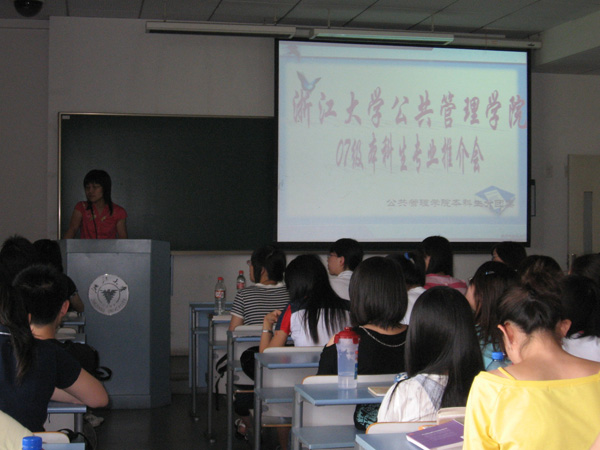 2008年5月17日 下午13:30, 公共管理学院07级本科生专业推介会之第一场——社会保障与风险管理、信息资源管理专业推介正式在东一A-214拉开帷幕。推介会旨在介绍公共管理学院下设的行政管理、土地管理、社会保障与风险管理、国际事务管理、信息资源管理和政治学六个专业,各系的权威老师将提供最全面、最详细的信息,并现场答疑解惑,为学生的专业确定导航。此场推介会由学院分团委新生工作部部长冯履冰主持,到场的嘉宾分别是社会保障与风险管理系系主任何文炯教授和施红老师,信息资源管理系系主任叶鹰教授和电子政务专家黄萃副教授。此外,广大07级新生参加了此次推介会。
