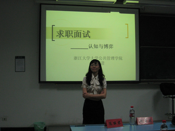 接下来陈丽君教授结合青马的其中一个课题“面试技巧与演讲沟通”为大家带来了精彩无比的讲座——“求职面试——认知与博弈”。陈教授以问题“用一个词或一句话来描述你眼中的面试”开场,用深入浅出的语言讲述了种种面试中要注意的事项,并挑战性地进行了现场模拟面试,使整个讲座妙趣横生,期间笑声不断,更重要的是同学们都受益匪浅。