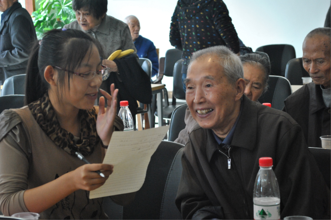 启动仪式结束后,志愿者们三五成群地搀扶老人走回了楼上的房间,并与老人们进行了亲切的交谈。现场有说有笑,其乐融融。精神矍铄的王道政爷爷是个下棋能手,他兴致勃勃地告诉志愿者,每当自己有空的时候他就会去公寓的棋牌室下棋,即便没人陪也喜欢一个人研究棋局。几番沟通后,王爷爷还主动向志愿者讲解了几招“布棋技巧”,细致的介绍让在场的同学们大开眼界。陈永焜老人对志愿者的来访表示十分欢迎,在志愿者们刚走进房间时,陈爷爷就像孩子似的高喊“欢迎欢迎,热烈欢迎”。他表示自己在三墩镇老人公寓已居住了两年,期间也经历了一些志愿者活动,感受到了志愿者们的热情与贴心,同时他反复强调希望这样的志愿者结对活动能够经常性地举办,让他们能孙辈们更好的沟通交流。令人印象最深的场景是志愿者对92岁老人邱信绥老人的采访。由于事先不知道爷爷听力不好,开始的沟通陷入了僵局。后来爷爷体贴地拿出纸笔,一笔一划地在纸上与志愿者们沟通交流,还亲切地询问了志愿者们现在的大学生活情况。在离开时邱爷爷从口袋里掏出了一把花生送到志愿者们的手中,让志愿者们在好好学习的同时也要注意身体,爷爷的体贴与关怀让志愿者们无不感动的热泪盈眶。