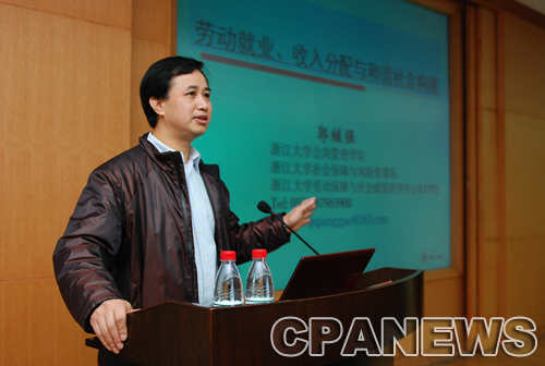 之后,郭继强教授带来主题为“劳动就业与收入分配”的讲座。郭教授首先从就业问题的复杂性和外部条件分析了中国的就业形势,并指出了劳动关系的三大中国特点:既有“强资本和弱劳动”的矛盾,又有“弱资本和弱劳动”的矛盾;中国的“强政治”环境;中国政治化的现状。接着,郭教授指出了收入分配中结构扭曲、秩序混乱和关系失衡三大问题,并强调这些问题会进一步影响到整个社会的秩序和流动性,影响社会的和谐。最后,郭教授总结,劳动就业和收入分配是“一连串事件”,要在改革和调整中构建和谐社会。
