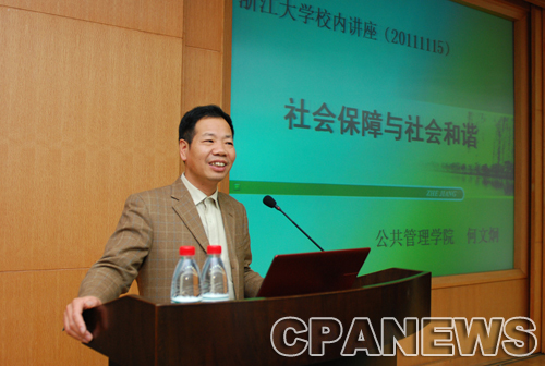 接下来是何文炯教授带来主题为“社会保障与劳动和谐”的讲座。何文炯教授首先从社会和谐的基本要求简单易懂地解释了和谐社会,又从社会保障的基本定义和主要项目强调了社会保障是政府提供的基本保障,并说明了社会保障和社会和谐的关系:社会保障制度的持续健康有效运行将促进社会和谐。在从公平性不足、可持续性不足和运行效率不高三方面解释了现行社会保障制度的主要缺陷之后,何文炯教授从社会保障政策目标、社会保障制度改革以及农民对社会保障的理解三方面对社会保障理念进行了反思。有关社会保障制度的优化,何文炯教授又从完善社会保障体系、改进社会保障制度、改善社会保障服务和优化社会保障制度运行环境四个角度阐释了我国社会保障制度有待优化。在现场提问环节中何文炯教授特别强调了学者的研究水平有待提高,要做一个有良心的学者。