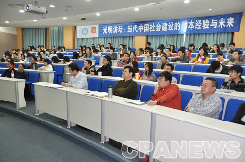 郁建兴教授围绕社会建设,从2012年全国两会热点议题入手,结合当前中国社会建设的现状,向我们阐释了社会建设的内涵——社会民生建设、社会管理创新、社会体制改革、社会能力建设。接下来,郁教授对2012年政府工作报告以及“十二五”规划的社会建设目标进行了深度解读,指出社会体制改革、社会管理创新的重要性与迫切性,“社会民生建设和社会管理创新需要社会体制改革作为环境支撑,社会体制改革和社会管理创新是社会能力建设的‘ 孵化器’”。郁教授通过翔实的图表,纵向分析了当前中国社会建设存在的主要问题。在社会管理体制创新方面,郁教授首先以“广东乌坎”事件为例,一针见血的指出了当前主体单一、行政控制、消极防范、刚性维稳的落后的社会管理方式;然后以浙江慈溪的“和谐促进会”为例,向我们展现了 “党委领导、政府负责、社会协同、公众参与”的社会管理新格局,并在最后总结道“进一步转变发展理念,明确提出社会建设与经济建设并重的指导思想”。郁教授深入浅出的分析,鞭辟入里的讲解,幽默风趣的语言引得现场掌声阵阵。