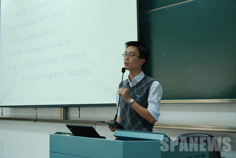 紧接着,卓亨逵老师对学院主要的学生工作进行了介绍。卓老师从学院着力打造的品牌学术活动“第六届模拟市长论坛”开始,依次介绍了青马学院,博雅计划,以及以小组为最小单元格划分、致力于个性化服务和多维度信息反馈的全新网格化学生管理模式。最后,他寄语10级学子:“站在何处并不重要,重要的是今后朝向哪个方向。只要方向确定了,找到了路,就不怕路远。”