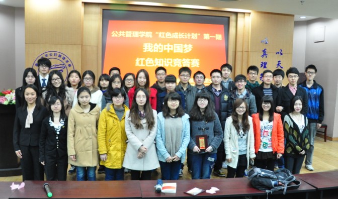 2012年3月23日晚,公共管理学院“红色成长计划”第一期——“我的中国梦红色知识竞答赛”在国会140举行。本次活动由劳动与社会保障10级团支部与公共管理学院10级本科生第二党支部承办。出席本次活动的有学院挂职团委书记、兼职辅导员潘临灵以及公共管理学院各个专业的同学。主持人为劳动与社会保障10级团支部团支书胡丹丹与10级第二党支部书记陈璐。