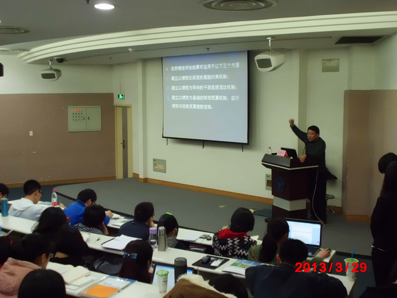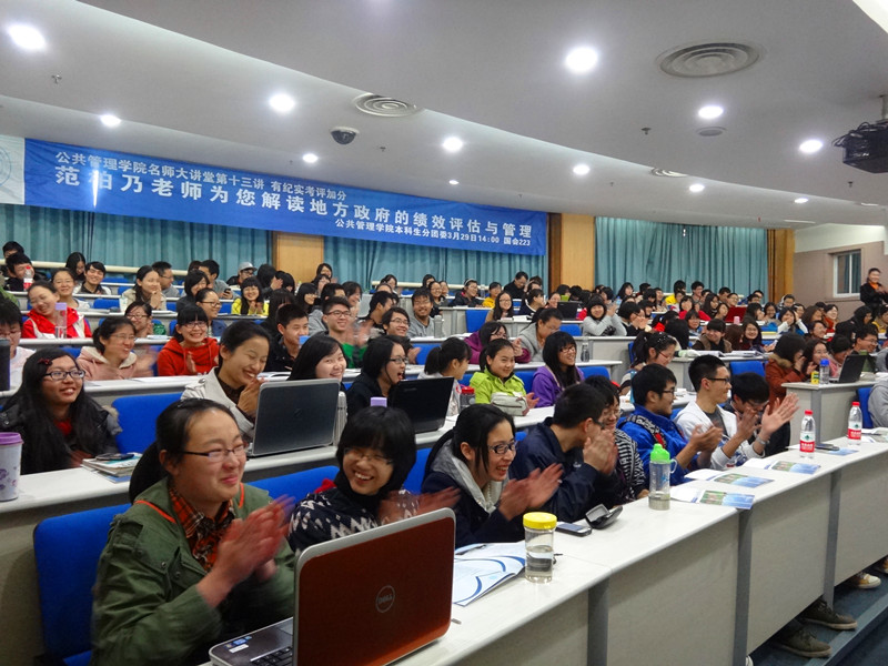 讲座一开始,范教授就要求全场起立。正当大家纳闷的时候,屏幕上显示出“加强政府绩效评估管理,努力降低政府行政成本,着力提高政府工作绩效”三句话。他接着说,这是政府绩效评估与管理研究的出发点和最终目的,并提议同学们大声地读出来。现场的听众和工作人员立即响应,声音响遏行云,并且有如出师作战时的庄严宣誓。
