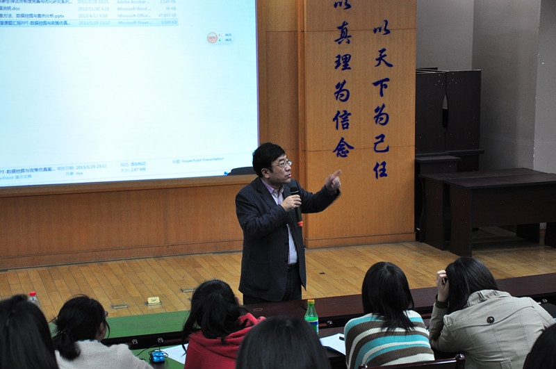 下午2点,讲座正式开始。米红教授首先向大家做了自我介绍,并展示了他的研究成果。作为国家人力资源和社会保障部专家咨询委员会委员,米红教授和他的团队先后多次为国家发展规划委员会、国家人口和计划生育委员会、国家统计局、国家人力资源和社会保障部及山东、浙江、福建、宁夏、深圳、青岛、厦门、宁波、苏州、扬州、嘉兴、湖州、淄博、临沂、北京市大兴区、东城区、门头沟区等政府部门从事“十五”、“十一五”和“十二五”人口规划和社会保障规划研究项目,并在核心期刊上发表了多篇论文,学术研究成果颇丰,赢得了在场同学们的阵阵惊叹。在自我介绍之后,讲座进入了正题,即对调研方法及数据处理知识的介绍。米红教授对调查方法做了一个简单的介绍,重点向大家解释了观察法和随机抽样调查的技巧。然后,米教授又从几个方面介绍了数据挖掘及政策仿真,他认为我们做模拟市长课题,对数据的挖掘和对政策的仿真是十分重要的。在讲完这两个部分的理论知识之后,米红教授又结合几个案例,再次阐述了其中的重点内容,加深了同学们的印象。