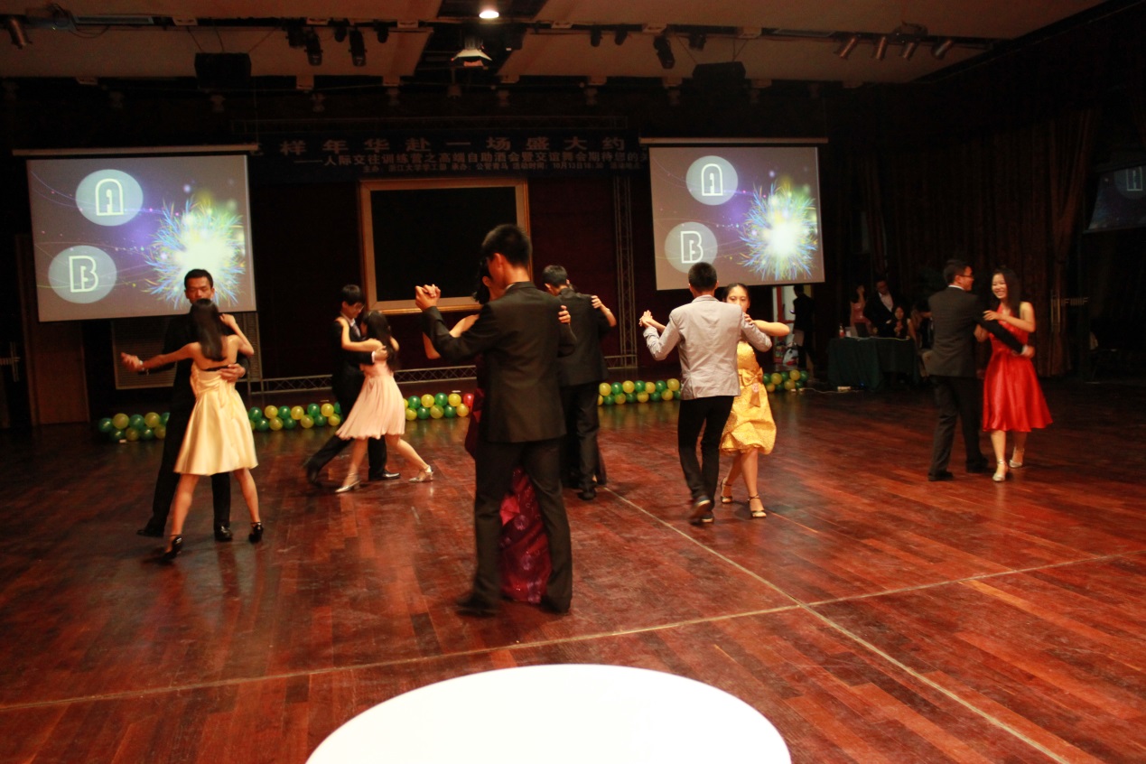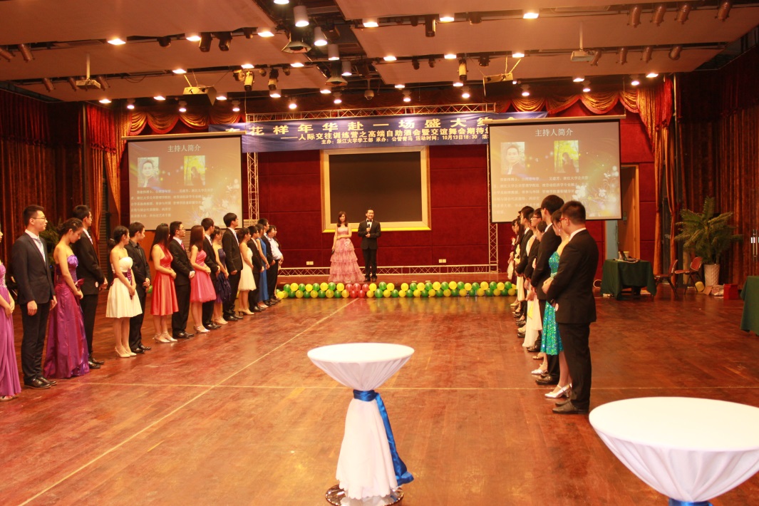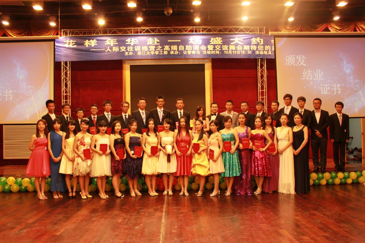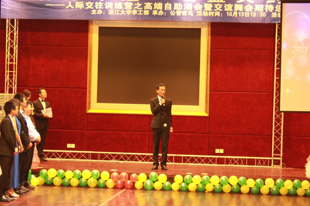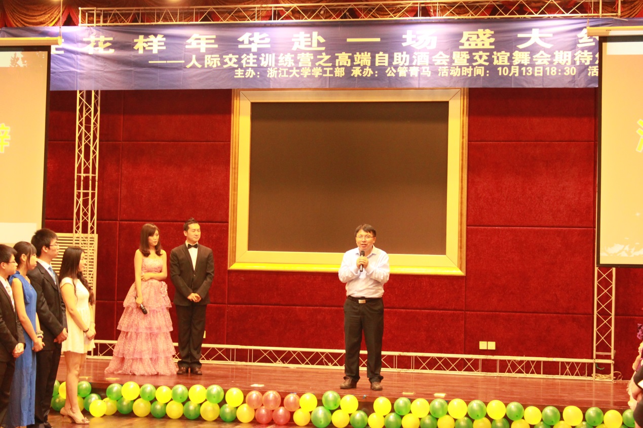 2013年10月13日晚,由浙江大学公共管理学院青年马克思主义者(学生骨干)培养学院五期学员承办的985三期“修身养德,笃行友贤”人际交往训练营高端自助酒会暨舞会于浙江大学科技园会议中心举行,训练营核心学员及舞伴共计34名同学盛装出席本次活动。出席本次活动的嘉宾有浙江大学公共管理学院党委书记沈文华老师,党委副书记包松老师,团委副书记卓亨逵老师,辅导员潘临灵老师。主持人由社会学系郭俊伟博士,兼职辅导员吴建芳老师担任。