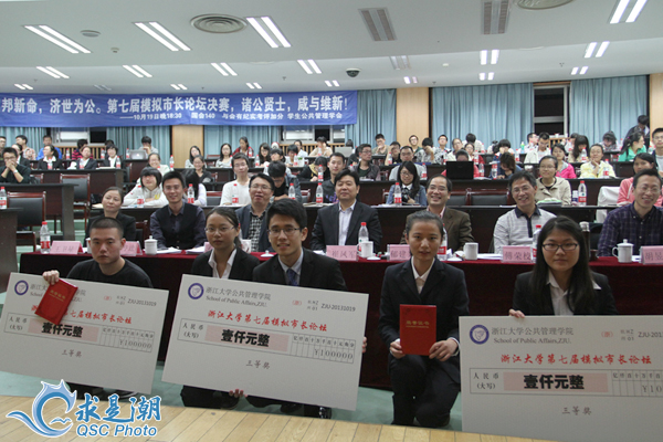 2013年10月19日星期六晚7点,万众瞩目的第七届模拟市长论坛决赛在蒙民伟楼140准时开始。本次论坛的主题为“改革是中国发展的最大红利”。会师决赛的四只队伍是乡土中国队、透骨生香队、Beyond队及方片六队。浙江省湖州市副市长崔凤军,浙江大学党委宣传部副部长李金林,计算机科学学院与软件学院党委副书记胡昱东,公共管理学院党委书记、副院长沈文华,常务副院长郁建兴,党委副书记包松,信息资源管理系主任傅荣校,本科生管理办公室主任王卫星,团委副书记卓亨逵担任现场评委。