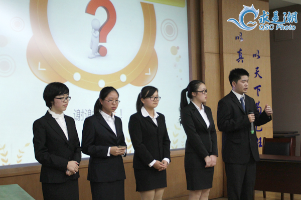 首先上场的是透骨生香队,他们带来的研究主题是“扩权强镇”。他们选择了在此方面有着突出成绩的绍兴县政府做为研究模板,深入了解分析了居民、政府、企业三方的利益关系,县政府向镇政府下放权力后带来的种种好处及伴随的问题,并给出了相应的解决措施。提问环节,各方提问积极,透骨生香队队员逐一进行了冷静详细的回答,其间,崔凤军市长还给该队队员的展示方式提出了宝贵建议,现场气氛十分活跃。